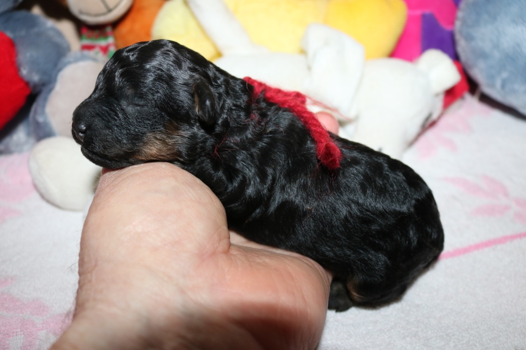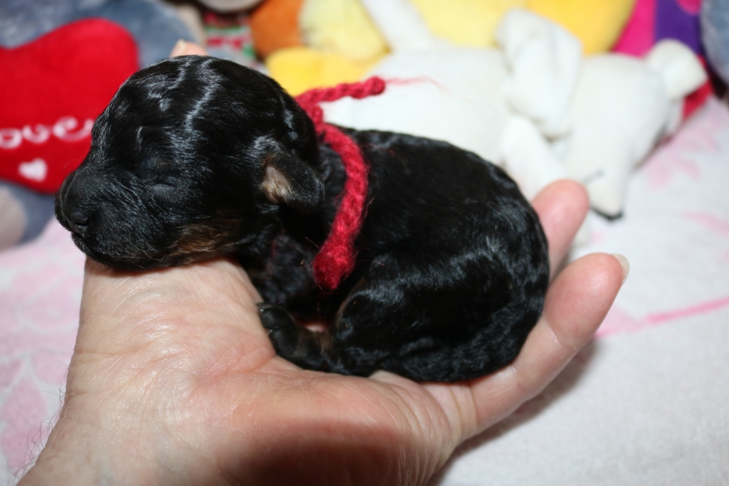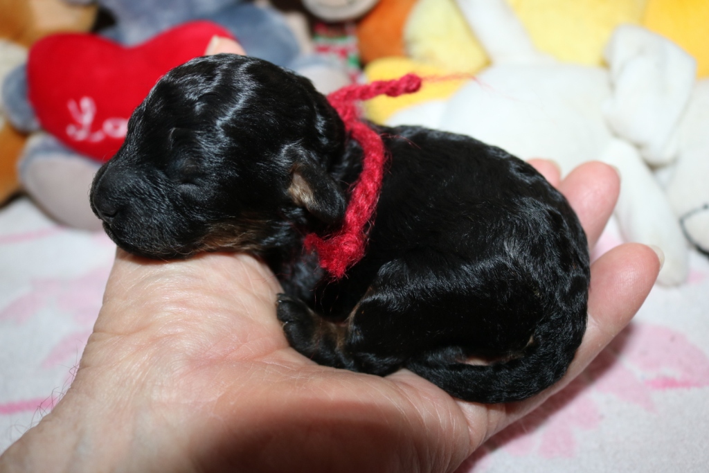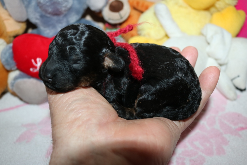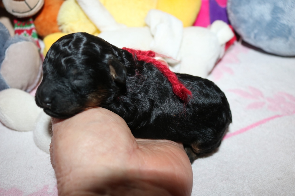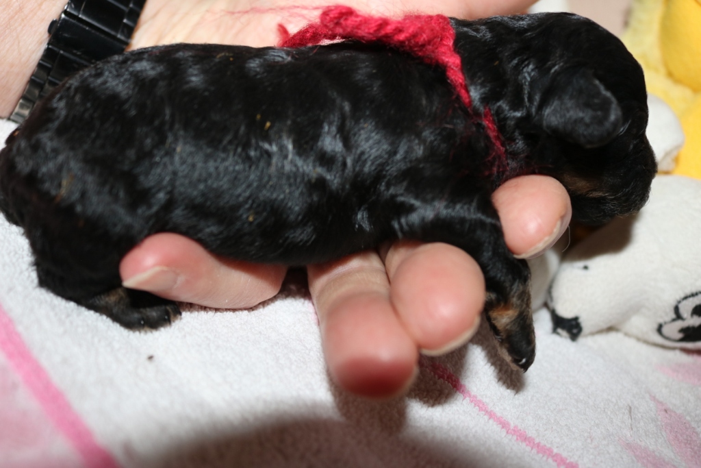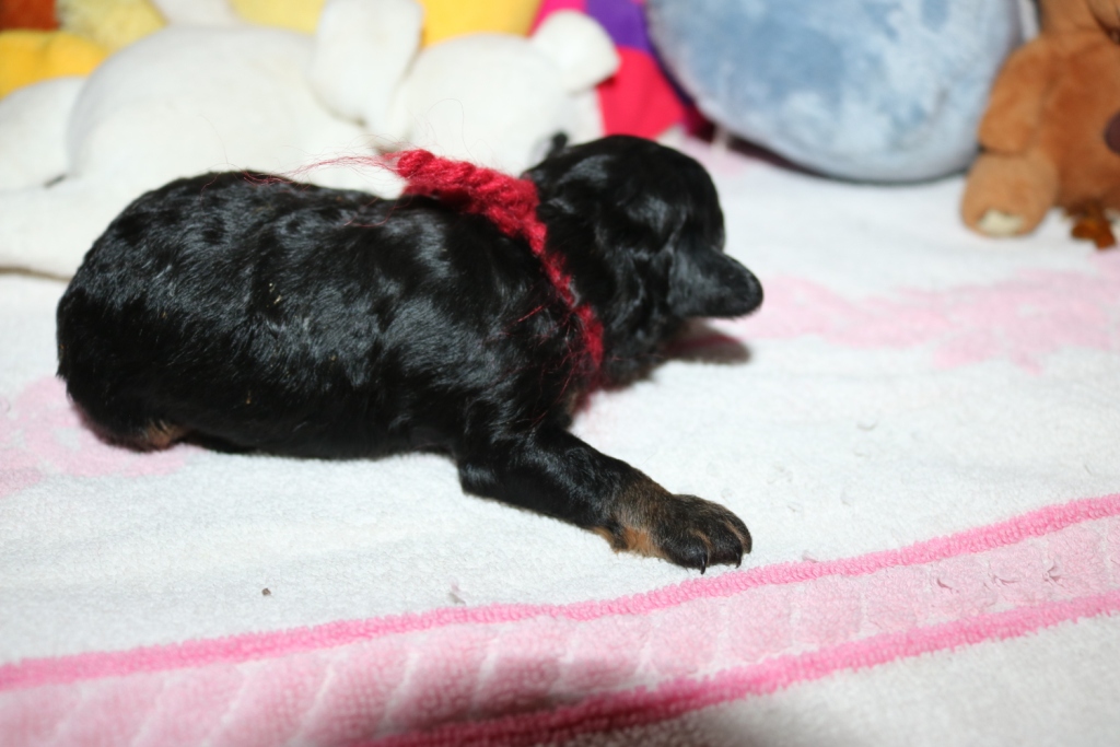 Mandy, Hündin schwarz/loh, Gewicht 296 g, Gesamtzunahme  130 g,     rotes Band