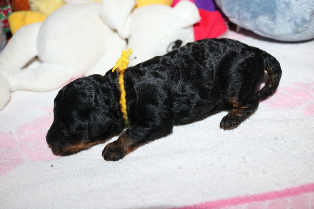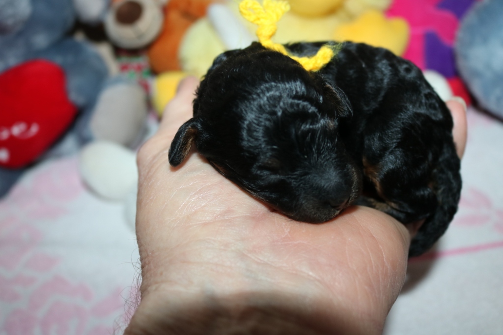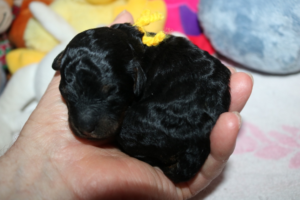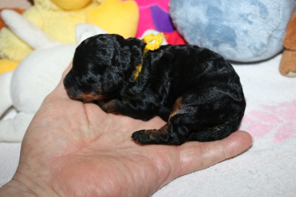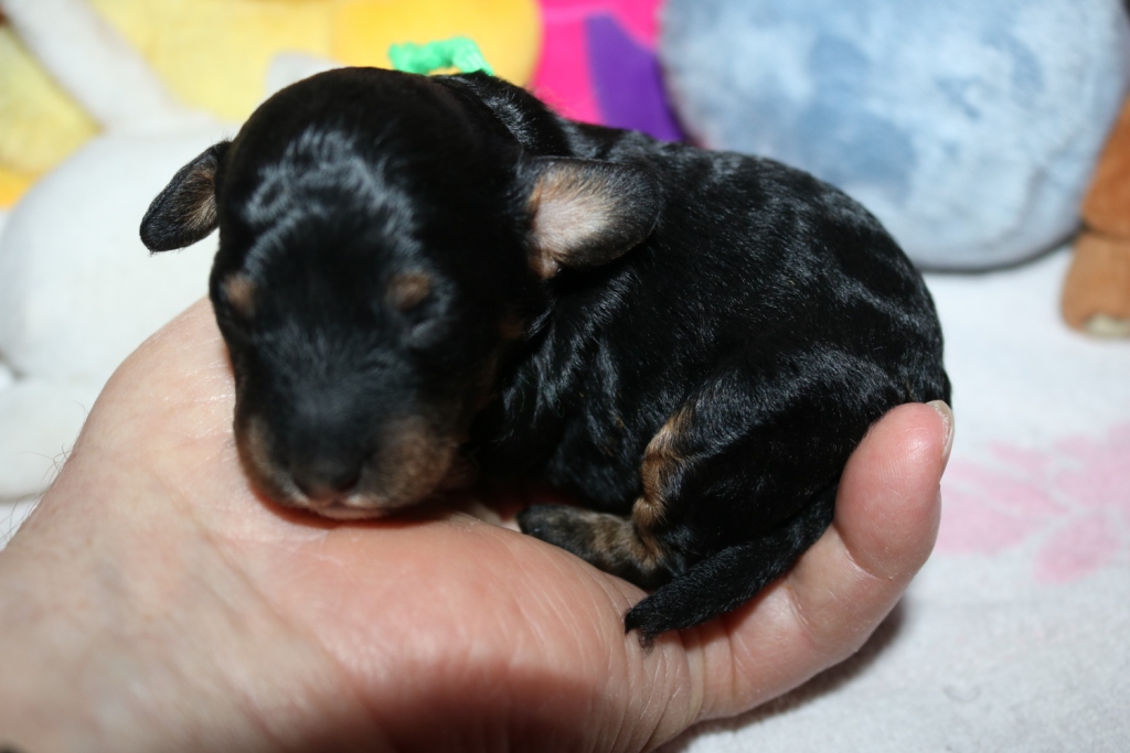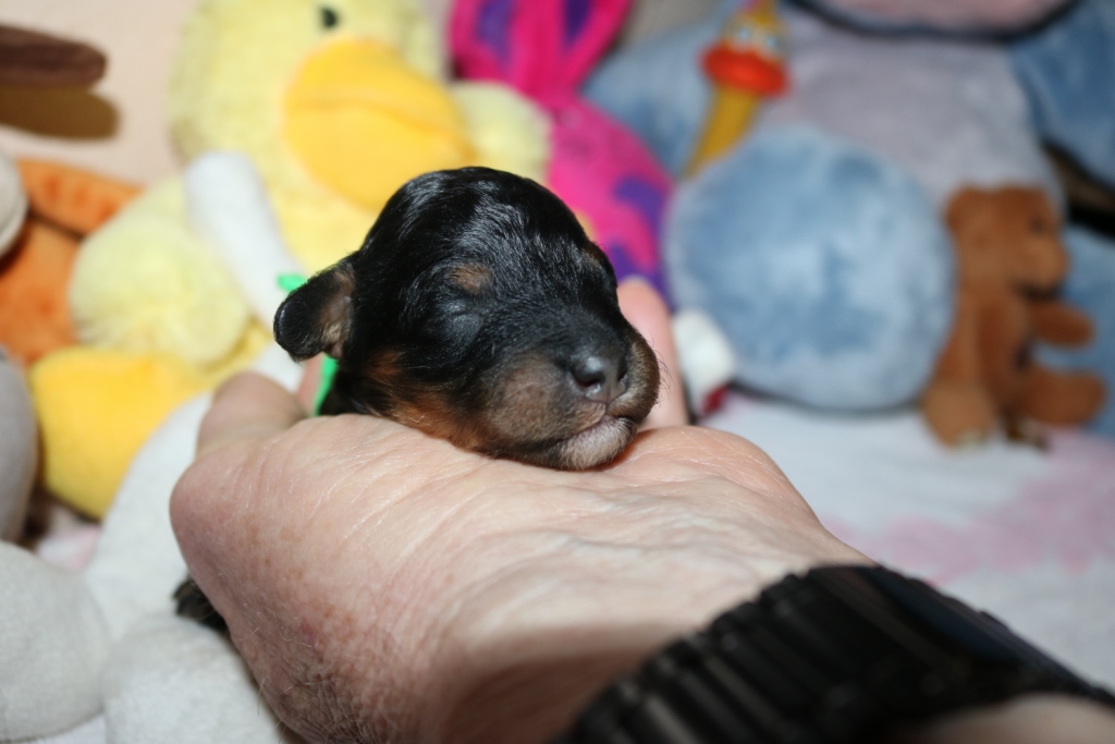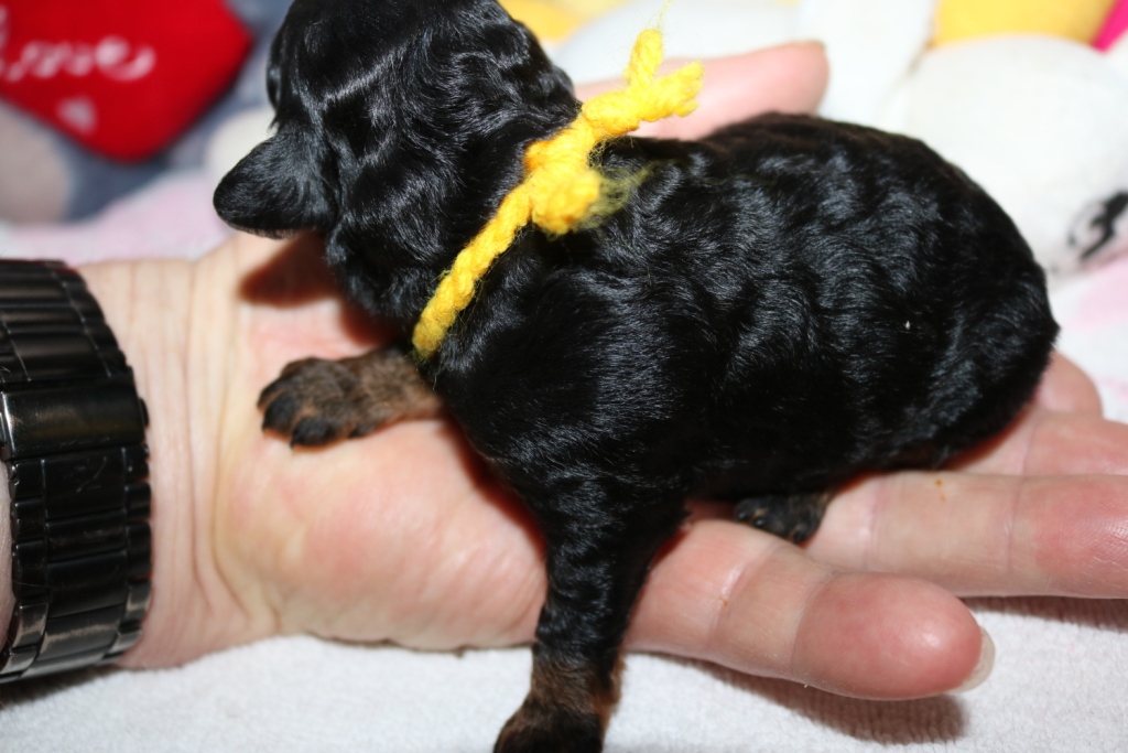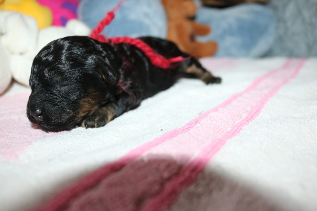 Mandy, Hündin schwarz/loh, Gewicht 296 g, Gesamtzunahme  130 g,     rotes Band