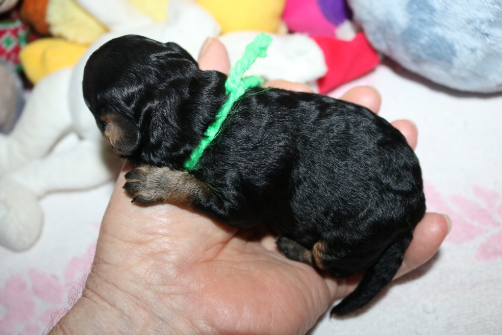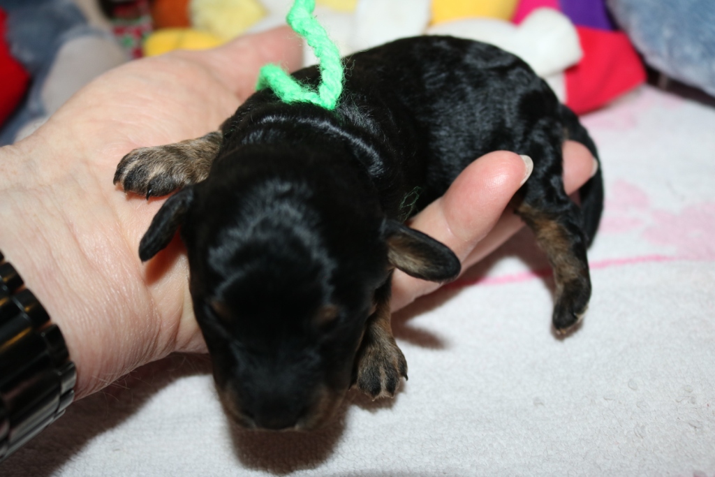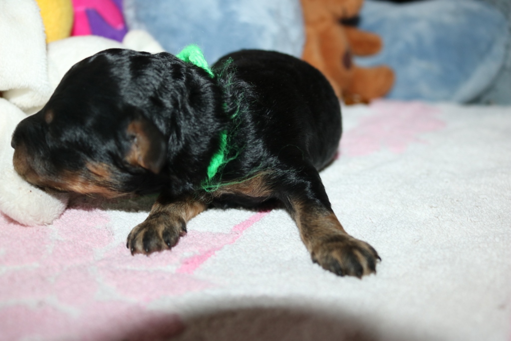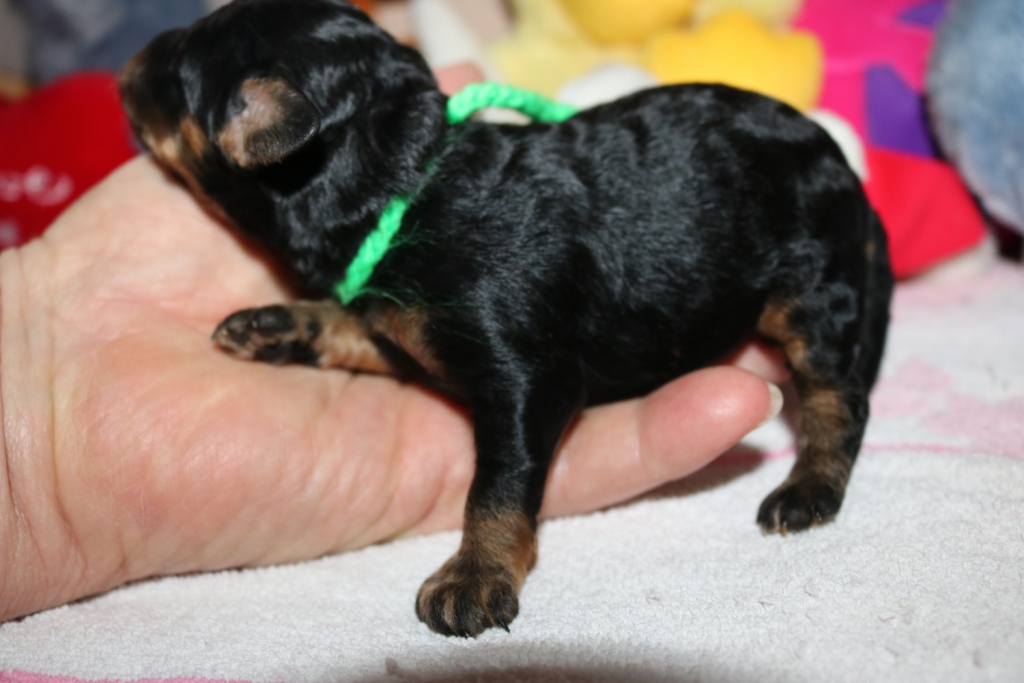 Milo, Rüde schwarz/loh, Gewicht 301 g, Gesamt- zunahme  136 g,   grünes Band
