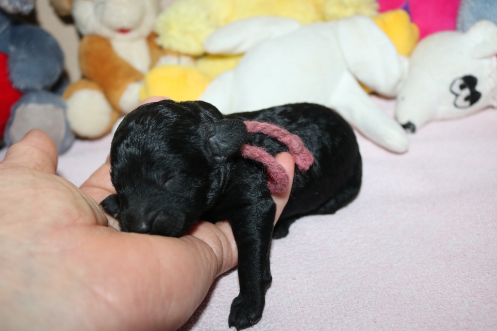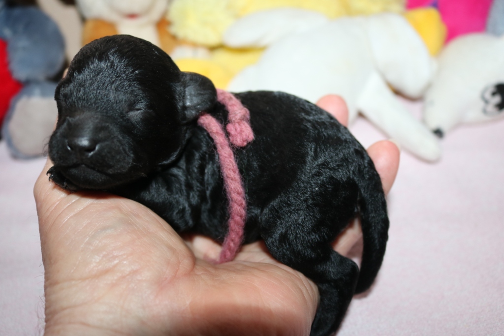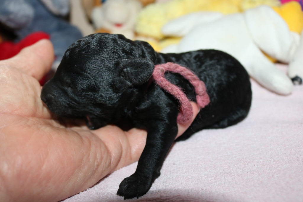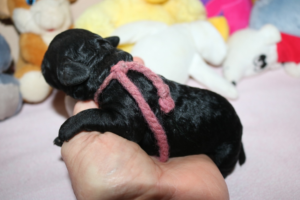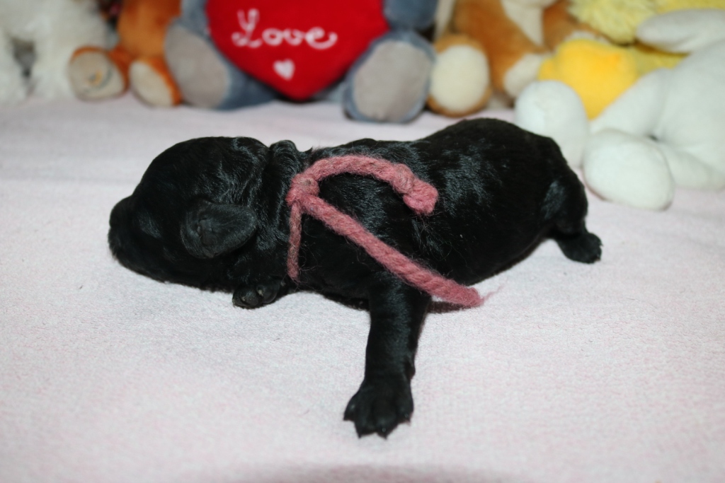 Hanna, Hündin, schwarz, Gewicht 321 g, Gesamt- zunahme 136 g, rosa Band