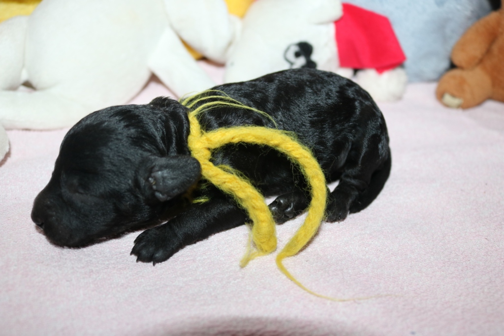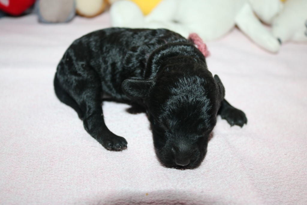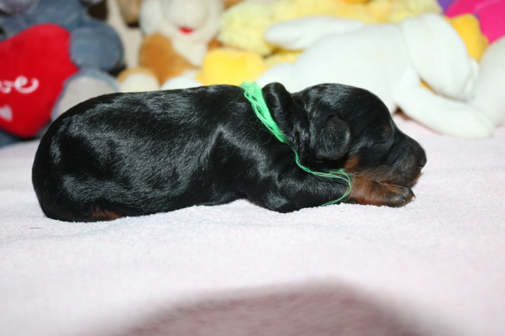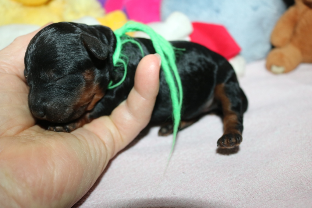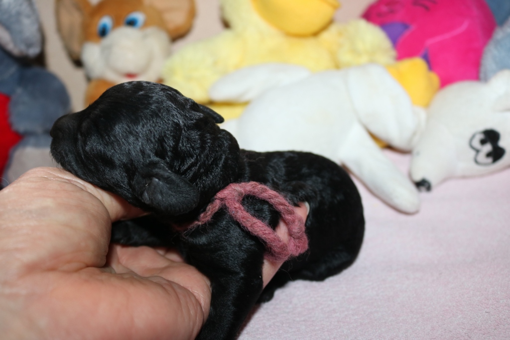 Hanna, Hündin, schwarz, Gewicht 321 g, Gesamt- zunahme 136 g, rosa Band
