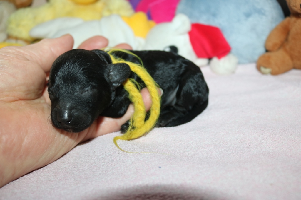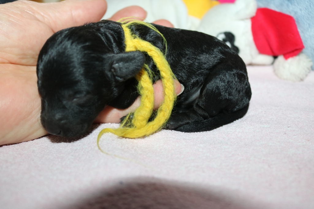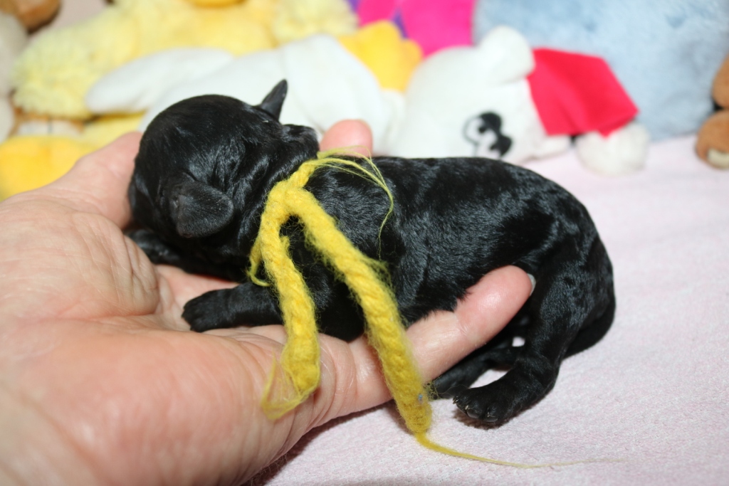 Havanna, Hündin, schwarz, Gewicht 255 g, Gesamtzunahme 103 g, gelbes Band
