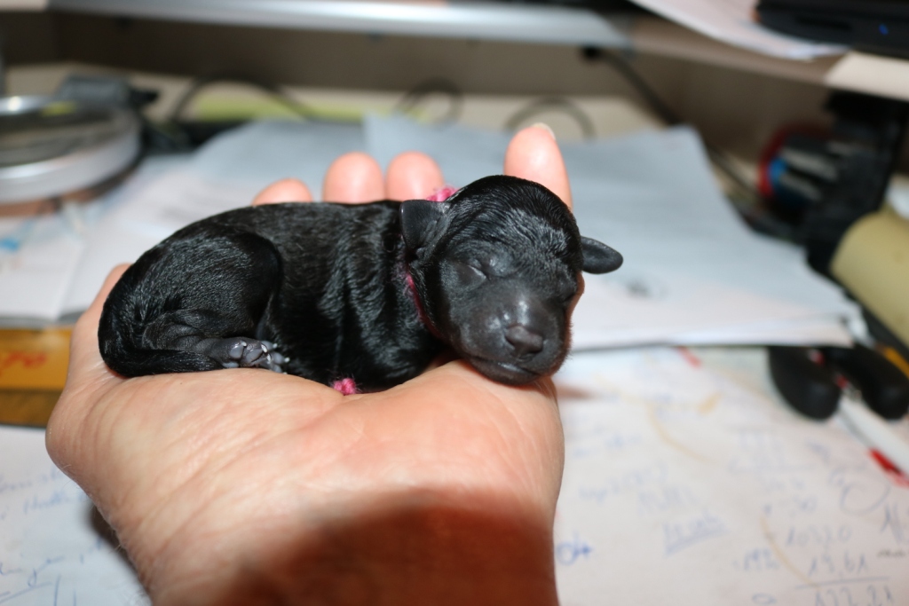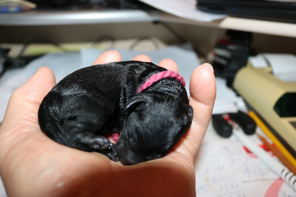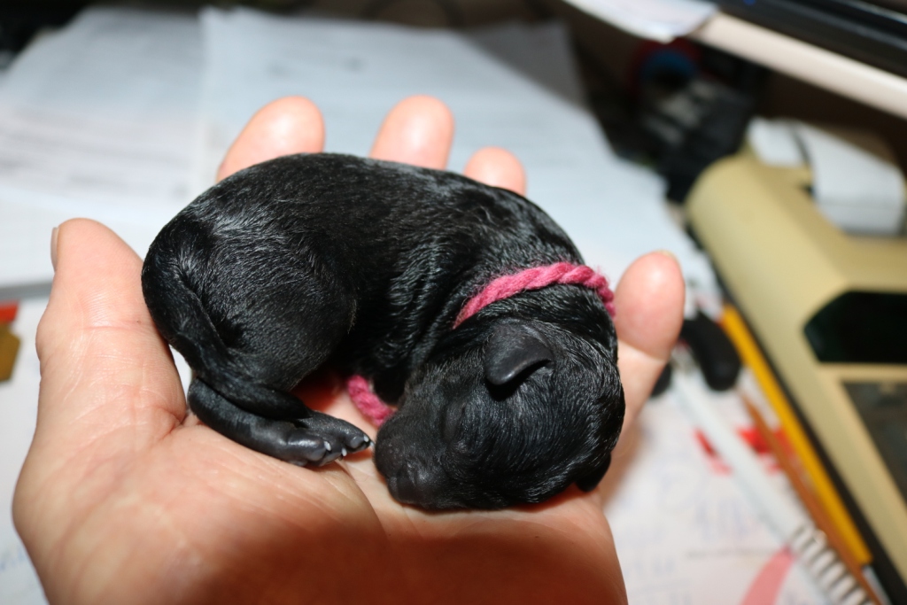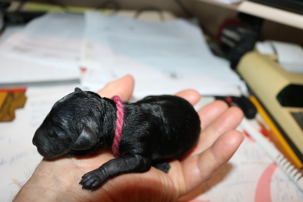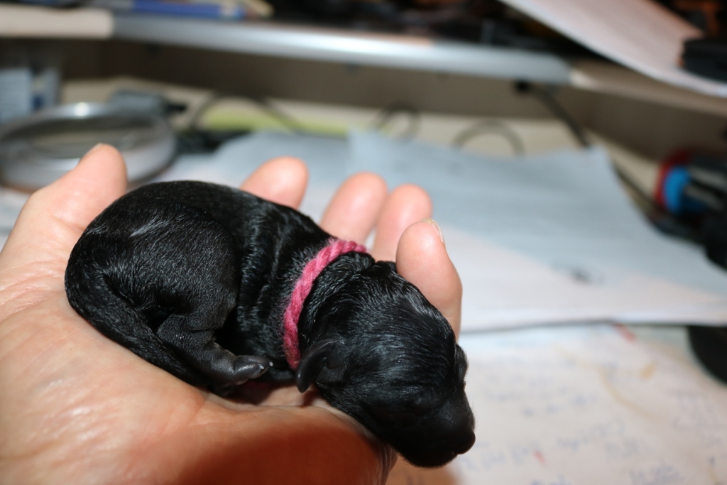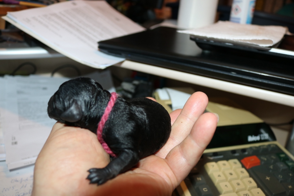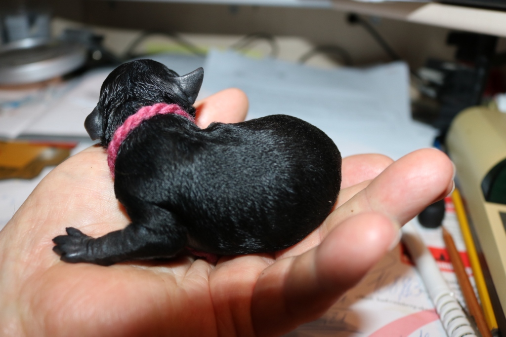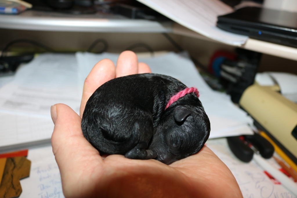 Hanna, Hündin, schwarz, geb. 25.10.2025 um 17:45 Uhr Geburtsgewicht 185 g, rosa Band