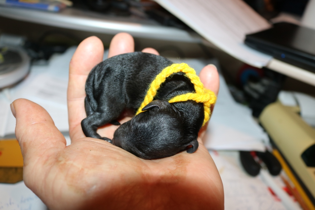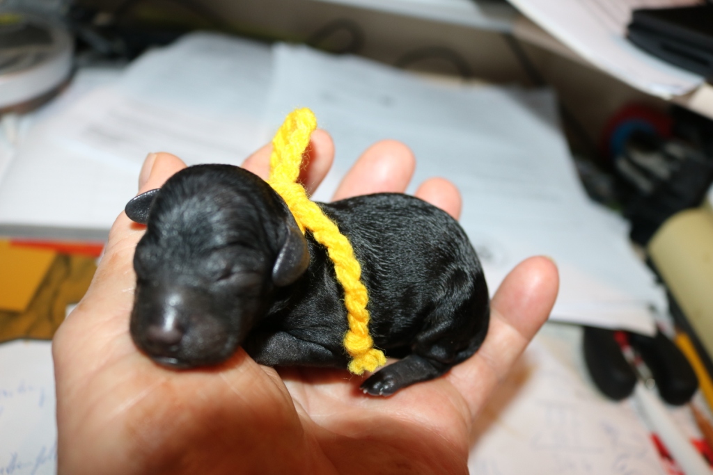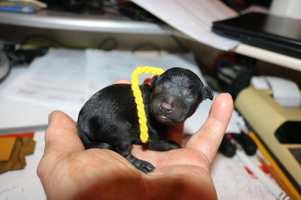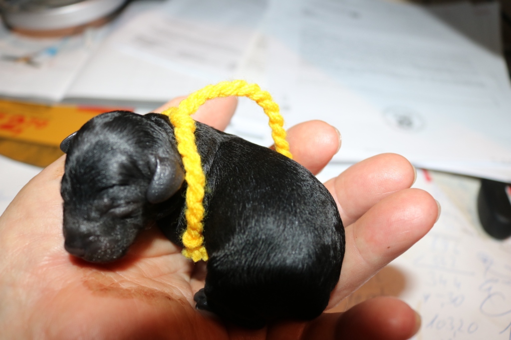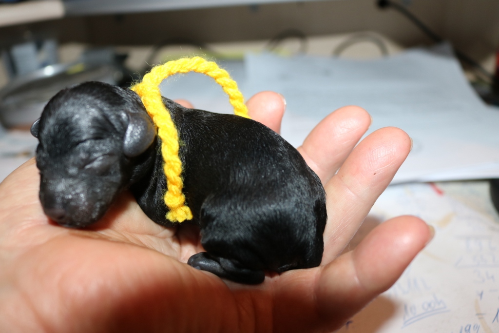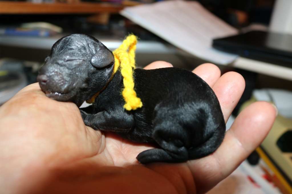 Havanna, Hündin, schwarz, geb. 25.10.2025 um 17:58 Uhr Geburtsgewicht 152 g, gelbes Band