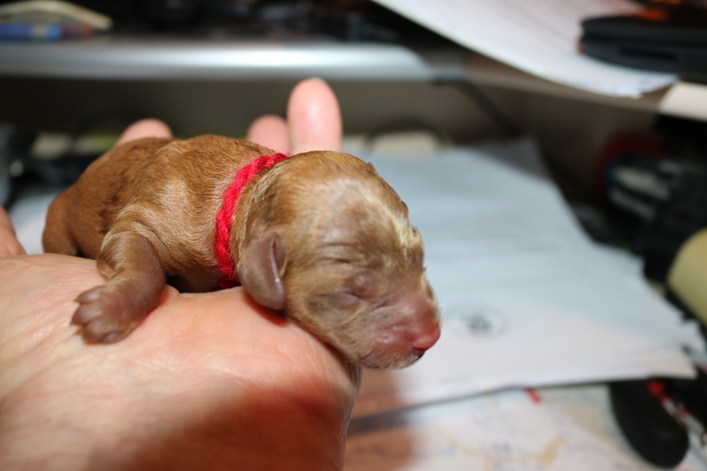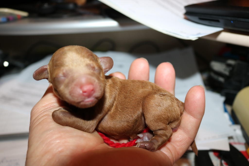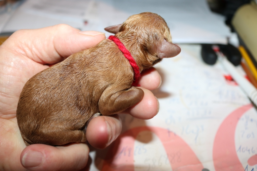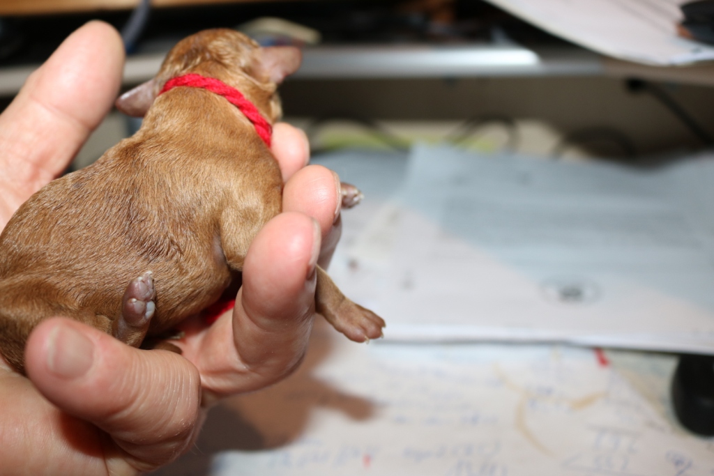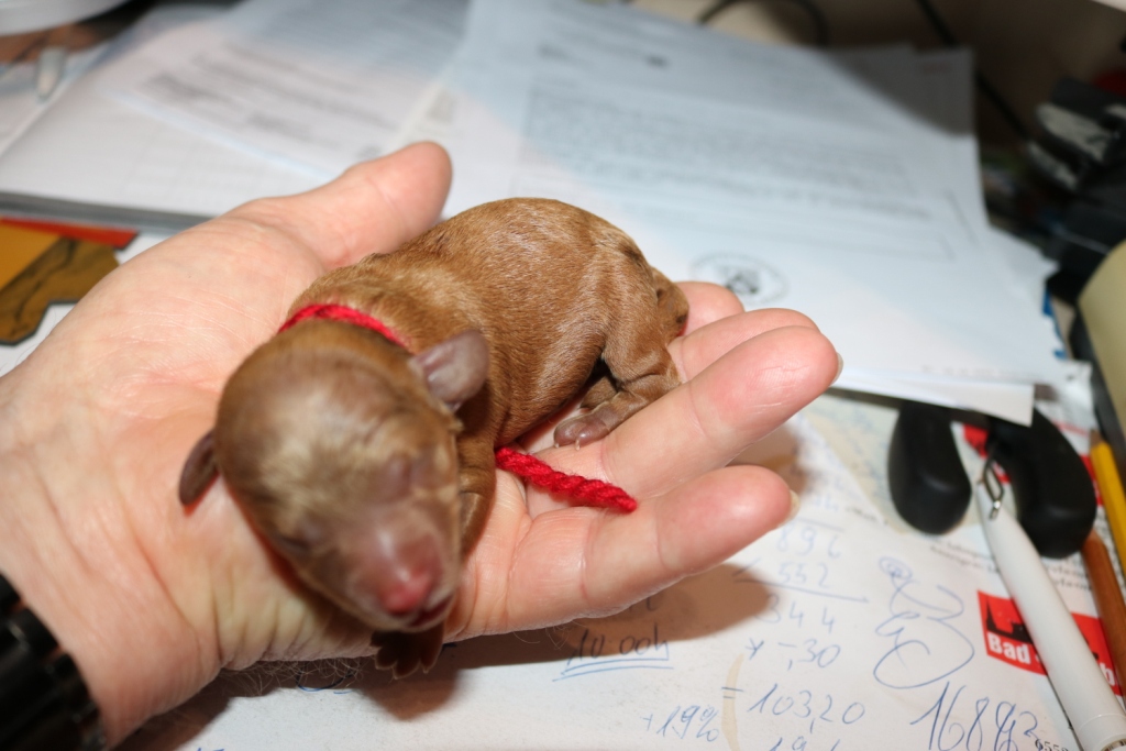 Holly, Hündin, falb, geb. 25.10.2025 um 19:11 Uhr Geburtsgewicht 174 g, rotes Band